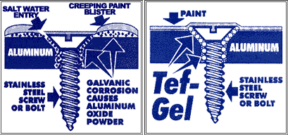 Tef-Gel può ottenere questa protezione perché non contiene siliconi, solventi di petrolio o solventi volatili, che evaporerebbero e lascerebbero vuoti. Ciò che contiene è polvere di PTFE, che in realtà comprende il 40% di Tef-Gel. Ciò significa che quando entrambe le superfici sono rivestite e accoppiate con Tef-Gel, non ci sono vuoti per gli elettroliti, come l'acqua salata, da aspirare per lunghi periodi di tempo. L'assenza di vuoti elimina la possibilità di corrosione di metalli dissimili. Tef-Gel riduce notevolmente l'attrito e riempie i vuoti attorno al metallo di base. L'eliminazione di questi vuoti impedisce all'ossigeno, all'acqua e all'umidità di entrare in contatto con il metallo di base, prevenendo ruggine e corrosione.