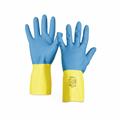 Guanto riusabile in LATTICE DI GOMMA NATURALE a doppia immersione (spessore maggiorato), clorinato, di forma anatomica per mano destra e sinistra, felpato internamente. Trattamento interno antibatterico. Ottima elasticità, buona sensibilità e presa anche di oggetti bagnati. Sufficiente resistenza meccanica e buona resistenza chimica a detergenti e detersivi anche concentrati ed a prodotti moderatamente aggressivi tipo acidi, chetoni, sostanze caustiche diluite