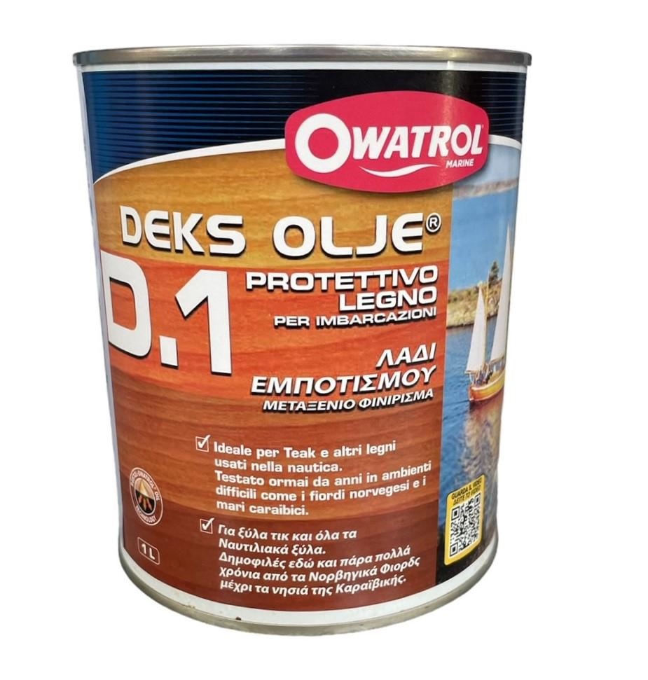 Owatro Deck Olje D1 . Satura e protegge in profondità i legni densi e/o grassi. Eccellente penetrazione del supporto - non filmogeno. Sostituisce gli oli di teck senza "gommare" o annerire. Trasparente, non maschera la venatura del legno. Stabilizza il legno - Si autoprotegge contro i funghi. Manutenzione semplice con acqua e sapone. Manutenzione rapida senza bisogno di carteggiare o sabbiare. Si utilizza da solo (aspetto opaco) o ricoperto con il DEKS OLJE D.2 (aspetto lucido).