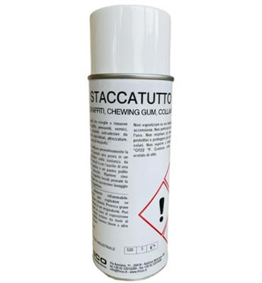 STACCATUTTO è un aerosol a base di solventi che scioglie e rimuove macchie e residui di graffiti , pennarelli , vernici , chewing-gum , etichette autoadesive , collanti .Si usa su superfici in cemento , marmo , pietra , mattoni , granito , cotto , gres porcellanato ,alluminio , metalli , vetro , plastica , resine resistenti ai solventi , moquettes e tappeti sintetici. Si consiglia test di resistenza della superficie al contatto con il prodotto.