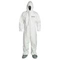 Tuta antistatica , microporosa monouso in tessuto non tessuto laminato bianco , 65gr/mq , con cappuccio, zip anteriore, bandella copri-zip, elastici a caviglie, polsini in maglia elastica , cuciture a saldatura. (prot. Type 5/6) UNI EN 31982-1:2004+A1:2010 UNI EN ISO 13982-1-2011 (prot. Type 6) - UNI EN 13034:2005+A1:2009 - UNI EN 1149-5 Taglie disponibili: M,L,XL,XXL,XXXL. Utilizzata come dispositivo di protezione abbinato ad altri specifici DPI , per operazioni di verniciatura , levigatura , laminazioni ove si è esposti a spruzzi di liquidi e in presenza di polveri.